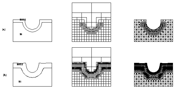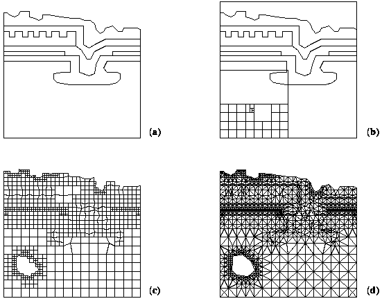 Forest, a 2D geometry and grid program, provides these capabilities. It stores and manipulates both geometry and grid data and can be used for diffusion, oxidation and device simulation. Quadtree based grid generation proceeds by enclosing the structure geometry in a root square and recursively dividing the root square resulting in a terminated lines mesh. The level of decimation can be controlled by a number of factors including user specification, solution variation, etc. The terminal squares are then triangulated using templates. The triangles are optimized for aspect ratio. For oxidation simulation, the geometry of the device is first evolved; the quadtree is rehashed and retriangulated. These operations are illustrated in the figures.