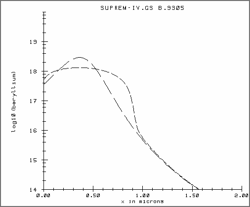 Examples 13, 14, and 15 illustrate the differences in using implanted vs. grown-in dopants, and how it effects the diffusivity values used. In Example 13, beryllium is implanted in GaAs, and the structure is annealed. The input file for the simulation is in the "examples/exam13" directory, in the file example13.in. The as-implanted and diffused beryllium profiles are shown in Figure 1. The implanted diffusion coefficients are used since there is an "implant beryllium ..." statement.