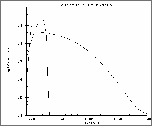 #plot the final profile select z=log10(bor) plot.1d cle=f axi=fThe first command picks the log base ten of the boron concentration to plot. The plot will be placed on the earlier plot. The "cle=f axi=f" instructs SUPREM-IV.GS to not clear and not compute new axes.
