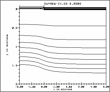 #some set stuff set echo #the x dimension definition line x loc = -2.0 tag = left line x loc = 0.0 spacing=0.05 line x loc = 5.0 tag = right #the vertical definition line y loc = 0 spacing = 0.02 tag = top line y loc = 1.5 spacing = 0.05 line y loc = 400.0 tag=bottom #the silicon wafer region silicon xlo = left xhi = right ylo = top yhi = bottom #set up the exposed surfaces bound exposed xlo = left xhi = right ylo = top yhi = top #calculate the mesh init boron conc=1.0e14 #the pad oxide deposit oxide thick=0.02 #deposit the nitride mask deposit nitride thick=0.05 etch nitride right p1.x=0.0 p2.x=0.0 #the boron implant implant boron dose=3e14 energy=40 pearson #the diffusion card method two.d diffuse time=30 temp=1100 dry #save the data structure out=oed.strThis example is very similar to Example 2. It starts by setting command line echoing and by instructing SUPREM-IV.GS to be relatively quiet about the progress of computation. The x line specification is different for the two dimensional device. For this example, an x line is placed at -2 microns and another at 5 microns for the left and right of the device. The area of most interest is the middle area near where the mask edge will be placed. Consequently, a tighter spacing is specified at the mask edge.